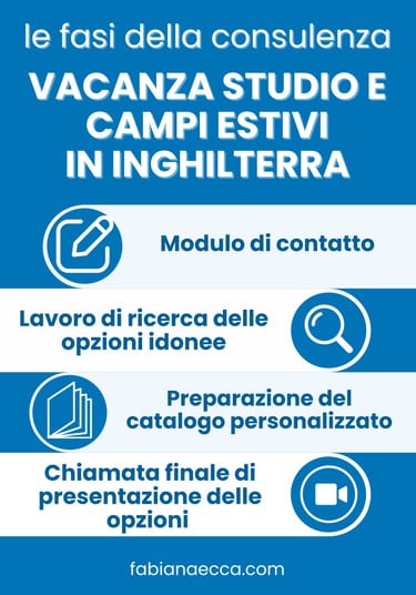 Il mio obiettivo è quello di trovare le Summer School o i Summer Camp in Inghilterra che rispondano alle tue esigenze e a quelle di tuo figlio/figlia, prediligendo Vacanze Studio che offrono alloggio nei dormitori della scuola/del college e campi estivi giornalieri in cui i bambini possano divertirsi, imparare l'inglese e, in alcuni casi, interagire anche con i bambini del posto. In caso di bisogno o di dubbi contatto le Summer School per avere chiarimenti per te. Fondamentalmente lavoro come "broker" di vacanze studio e campi estivi in Inghilterra, proponendoti una gamma di opzioni valide e certificate.