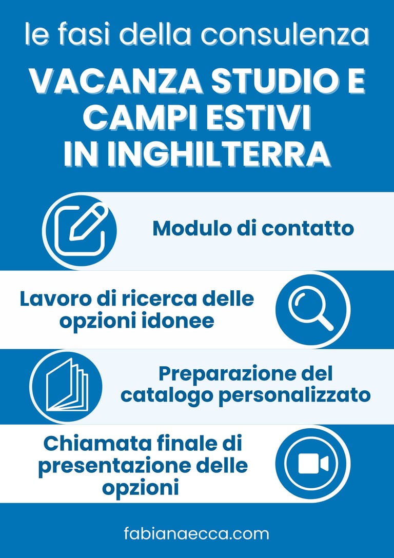 Prima di tutto ti invito a contattarmi tramite il modulo di contatto a fondo pagina condividendo i dettagli del tipo di vacanza studio che cerchi, l'età di tuo figlio/a, il suo livello di inglese, il periodo ideale per la sua vacanza studio, quello che ti aspetti ed io ti risponderò entro 72 ore.